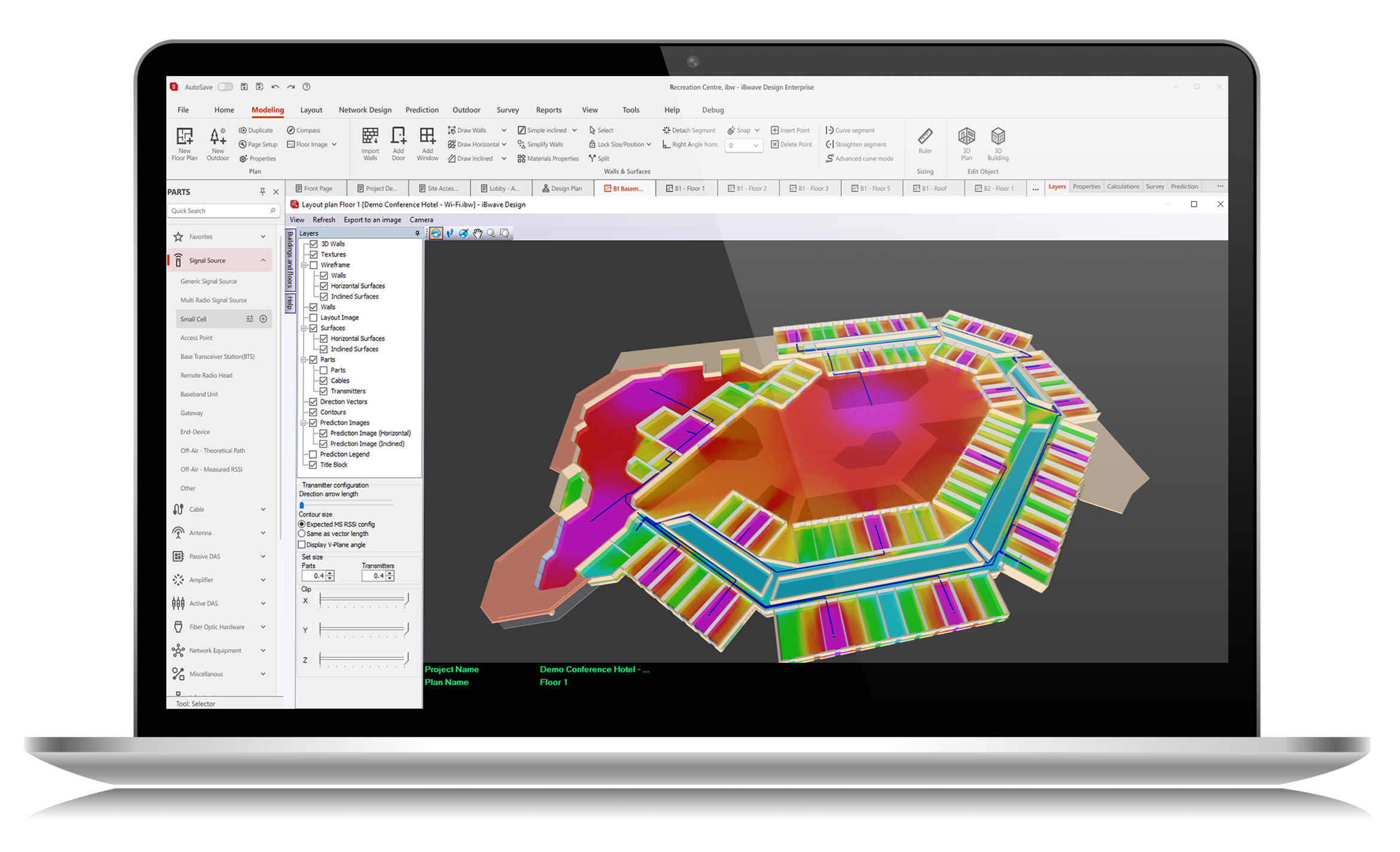 With the ability to model your venues in 3D and a large database of all Wi‑Fi network components, you can impress your customer with a 3D visual of what the network will look like in their venue, and how well it will perform.