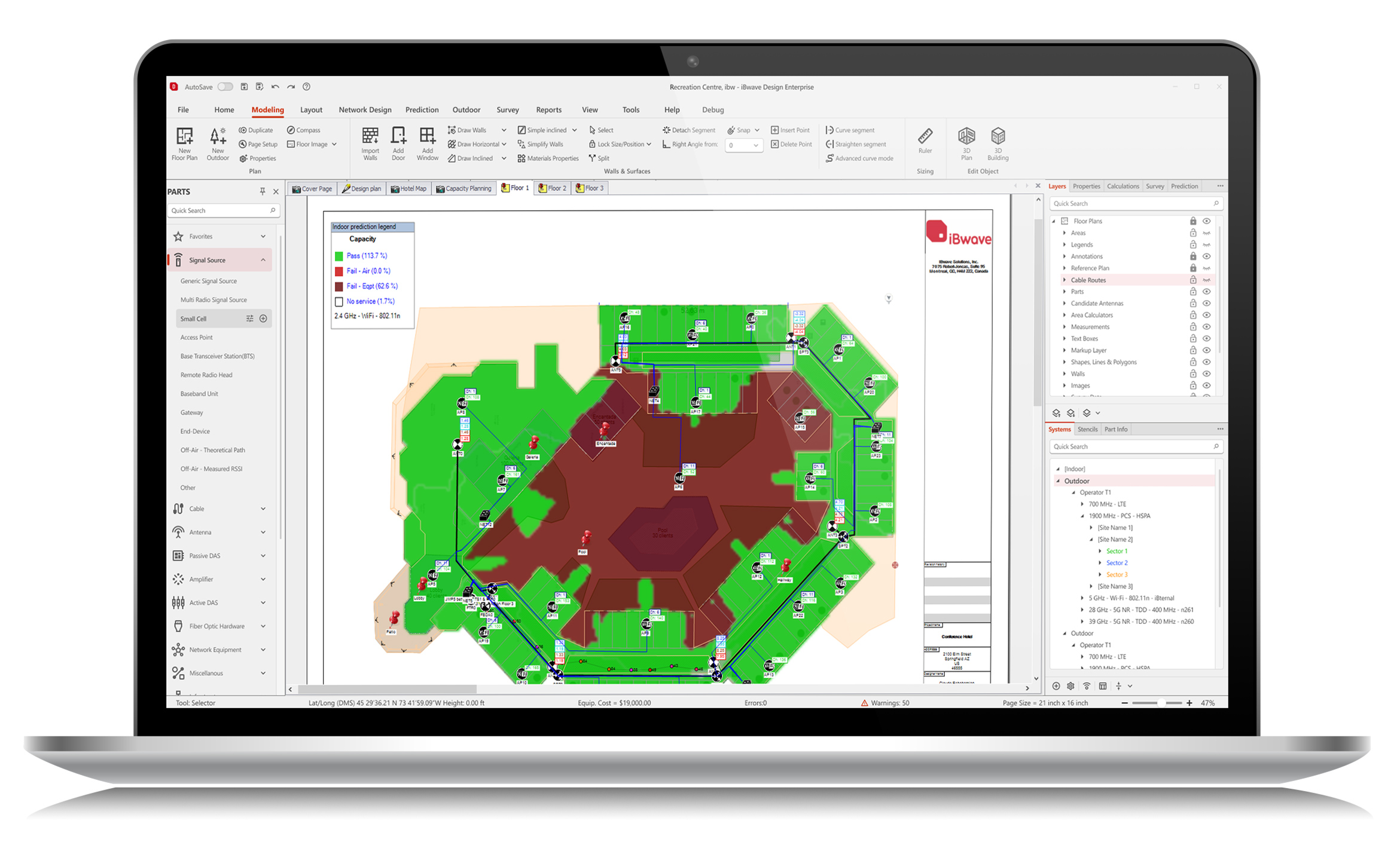 With the iBwave Private Networks (Wi‑Fi) advanced propagation and capacity analysis engine you drastically reduce the risk of network re-design costs post-installation by accurately simulating the performance of your network before it’s deployed.